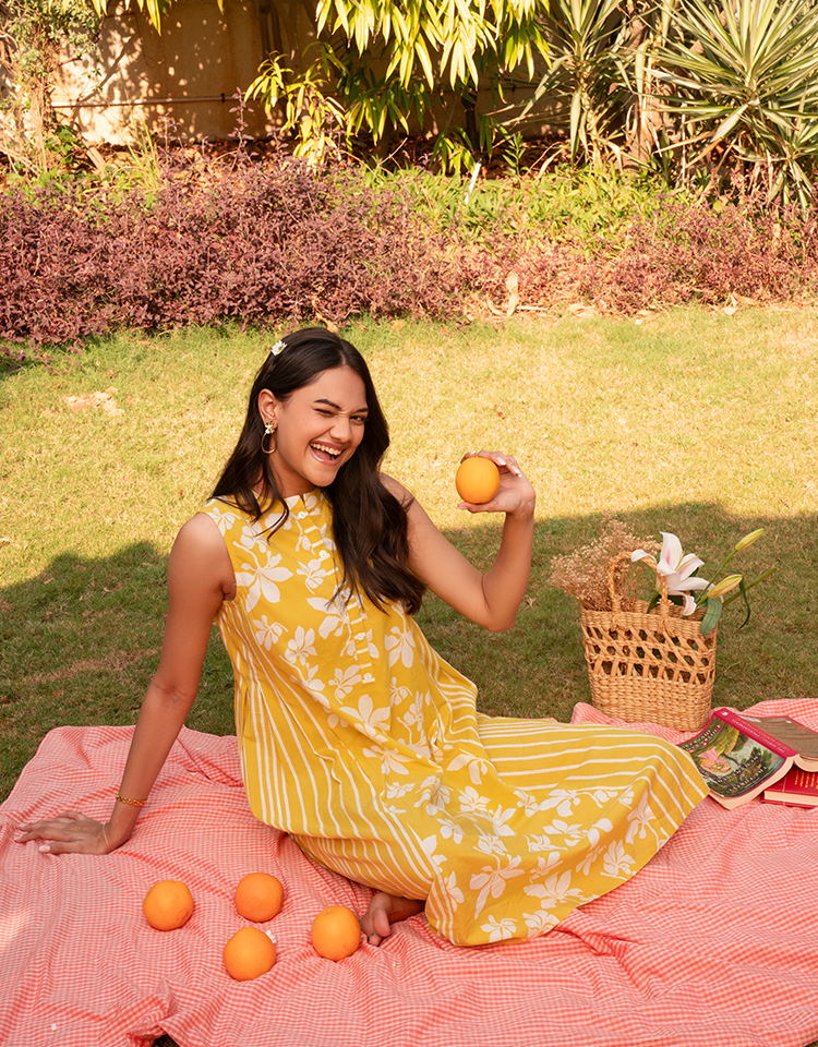 Pocketed dress in woven kantha fabric with elasticated side gathering and block print.