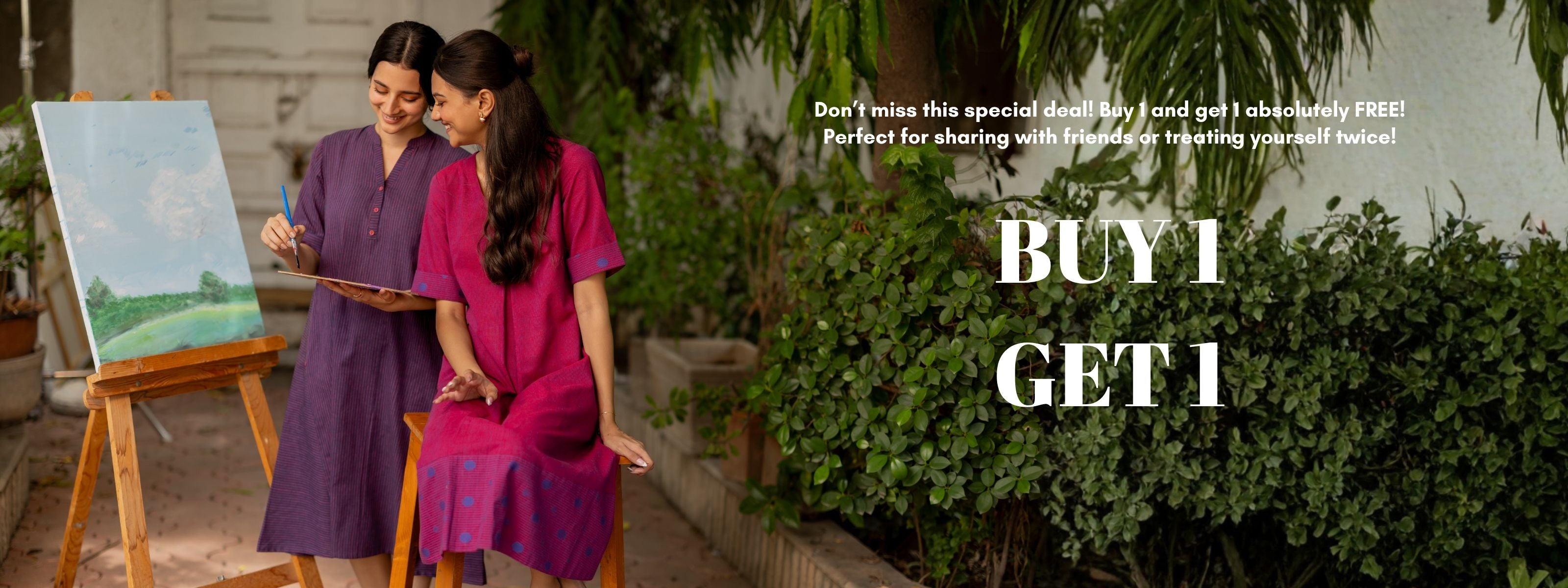 V-Neck cotton flex shirt dress in an 'ikat' weave inspired print with handwork.
