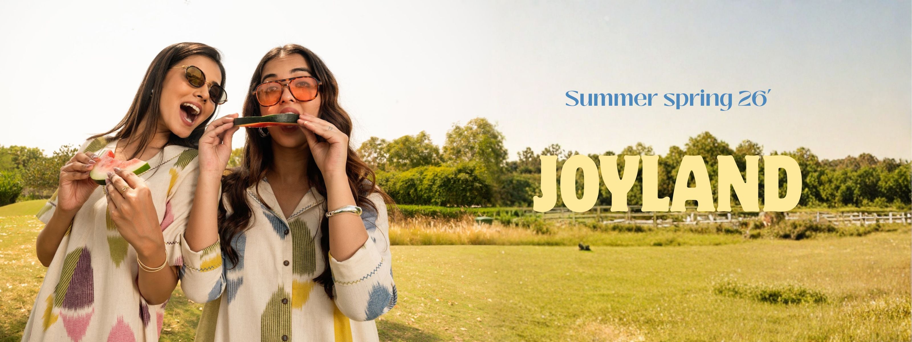 JOYLAND - V-Neck cotton flex dress in an 'ikat' weave inspired print with handwork.