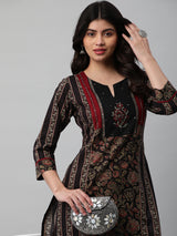 This straight paneled kurta features a beautiful block print design enhanced with delicate sequin handwork. The clean lines and classic silhouette make it a versatile addition to any wardrobe. The block print adds a touch of traditional charm, while the sequin handwork adds a touch of sparkle. Elevate your style with this unique piece.